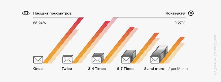 Количество просмотров (Open Rate) и среднее количество продаж зависят от масштаба интернет-магазина. Чем он больше, тем выше процент покупок, совершенных с рассылок.